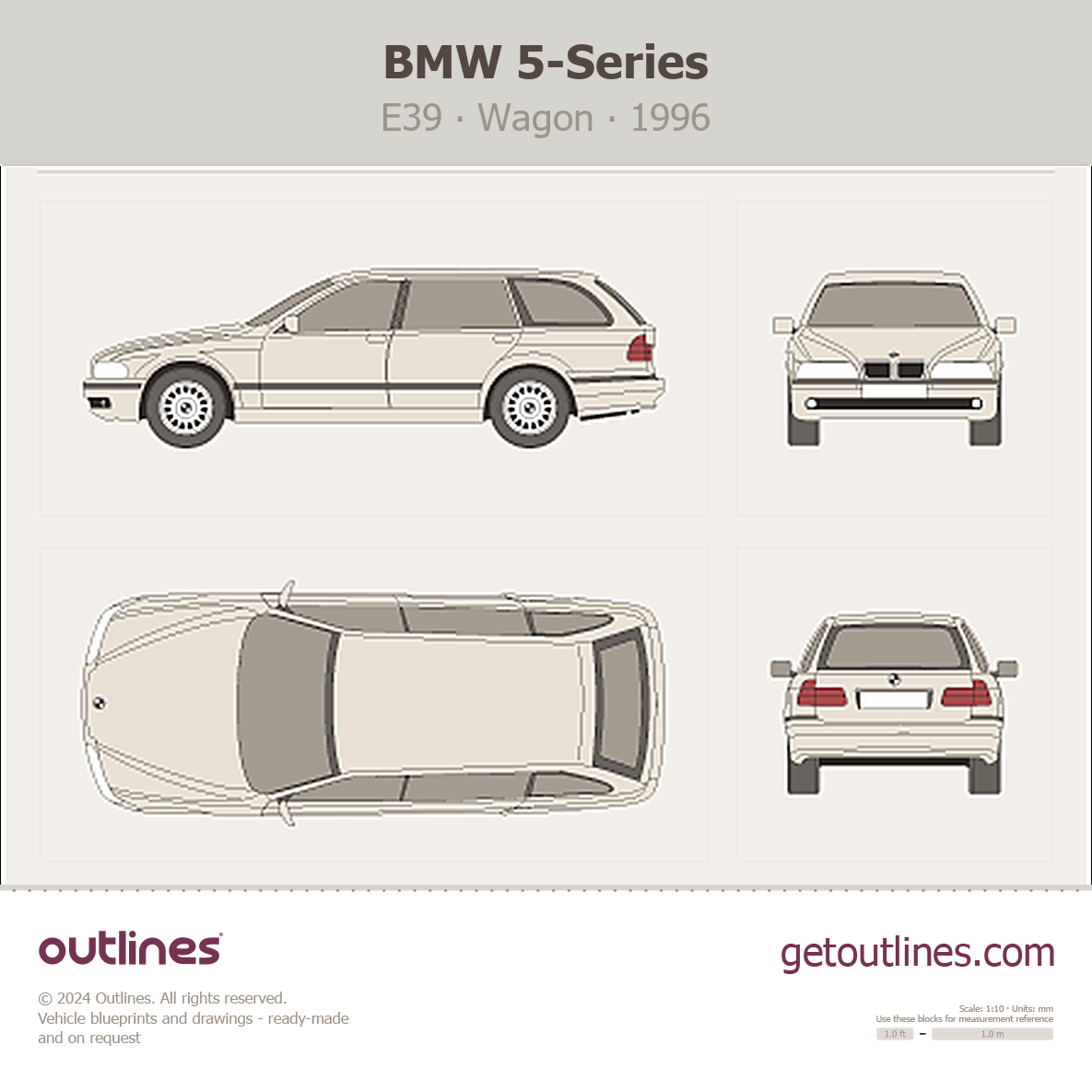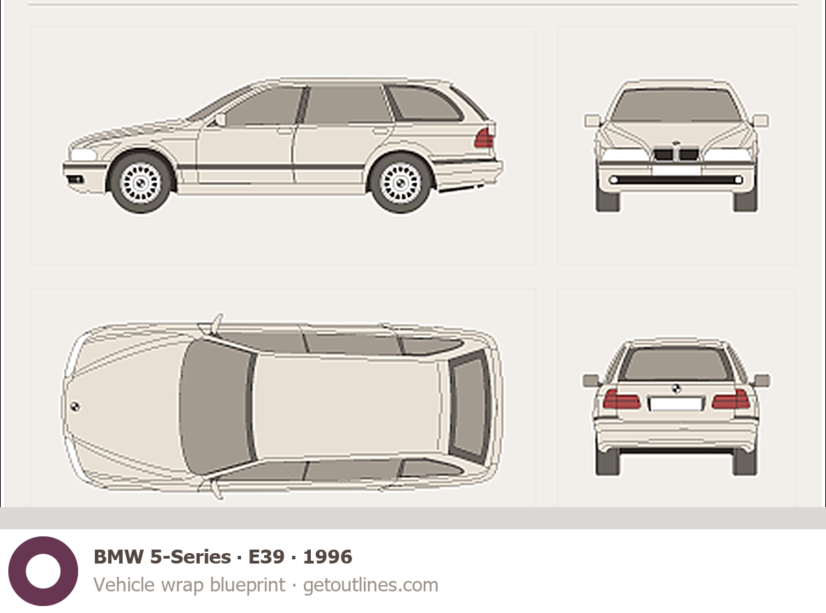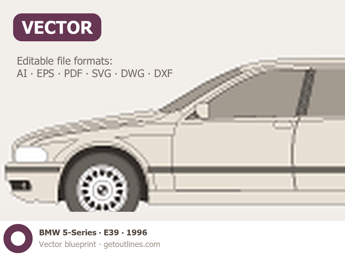Buy this BMW 5-Series E39 blueprint and line drawing in high-quality editable vector file formats. Best for 3D and car wrap design.
