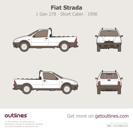 Buy this Fiat Strada 1 Gen ∙ 278 blueprint and line drawing in high-quality editable vector file formats. Best for 3D and car wrap design.