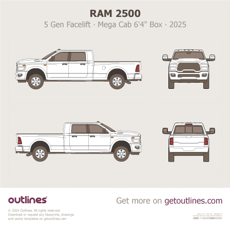 This 2025 Ram 2500 5 Gen Facelift ∙ Heavy Duty ∙ HD Mega Cab 6'4" Box Pickup Truck blueprint helps designers, wrap studios, and 3D artists simplify their workflow and save valuable time for creative work instead of routine tasks.
