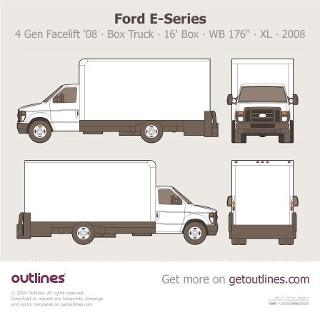 This 2008 Ford E-350 4 Gen Facelift '08 Box Truck ∙ 16' Box ∙ WB 176" ∙ XL ∙ Morgan Dry Freight ∙ Spartan ∙ Utilimaster ∙ E350 Van blueprint helps designers, wrap studios, and 3D artists simplify their workflow and save valuable time for creative work instead of routine tasks.
