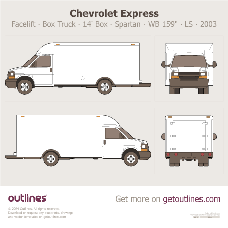 This 2003 GMC Savana 3500 Box Truck ∙ Facelift '03 14' Box ∙ Spartan ∙ WB 159" ∙ LS ∙ WT ∙ G3500 Heavy Truck blueprint helps designers, wrap studios, and 3D artists simplify their workflow and save valuable time for creative work instead of routine tasks.