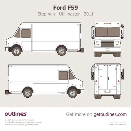 This 2011 Ford F59 Step Van ∙ Utilimaster 14' ∙ P700 ∙ P900 ∙ P1000 ∙ Aeromaster ∙ F-59 ∙ F-Series Chassis Van blueprint helps designers, wrap studios, and 3D artists simplify their workflow and save valuable time for creative work instead of routine tasks.