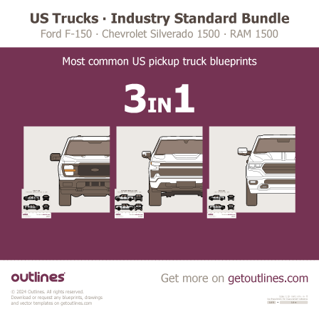 Buy this Ram 1500 US Trucks ∙ 3 in 1 ∙ Industry Standard Bundle blueprint and line drawing in high-quality editable vector file formats. Best for 3D and car wrap design.