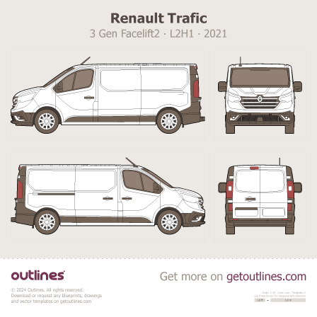 This 2021 Renault Trafic 3 Gen Facelift2 ∙ X82 Panel Van ∙ L2H1 Van blueprint helps designers, wrap studios, and 3D artists simplify their workflow and save valuable time for creative work instead of routine tasks.