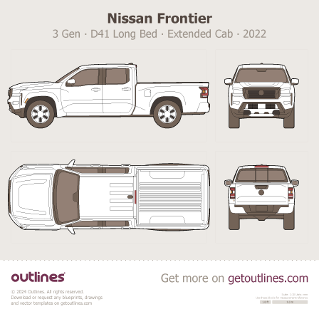Buy this Nissan Frontier 3 Gen ∙ D41 blueprint and line drawing in high-quality editable vector file formats. Best for 3D and car wrap design.