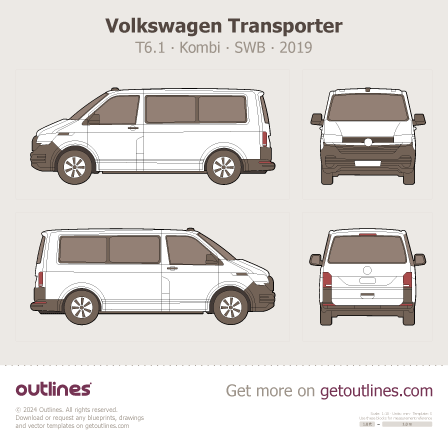 This 2019 Volkswagen Transporter T6.1 Kombi SWB Wagon blueprint helps designers, wrap studios, and 3D artists simplify their workflow and save valuable time for creative work instead of routine tasks.