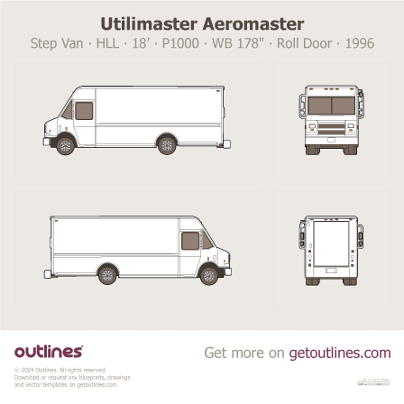 This 1996 Utilimaster Aeromaster Step Van ∙ HLL 18’ ∙ P1000 ∙ WB 178" ∙ Roll Door Van blueprint helps designers, wrap studios, and 3D artists simplify their workflow and save valuable time for creative work instead of routine tasks.