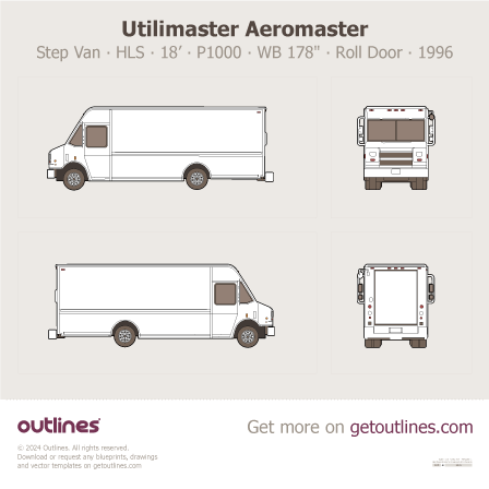 This 1996 Utilimaster Aeromaster Step Van ∙ HLS 18’ ∙ P1000 ∙ WB 178" ∙ Roll Door Van blueprint helps designers, wrap studios, and 3D artists simplify their workflow and save valuable time for creative work instead of routine tasks.