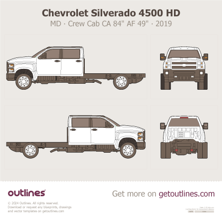 This 2019 Chevrolet Silverado 4500 HD 1 Gen ∙ MD Chassis ∙ Crew Cab ∙ CA 84" ∙ AF 49" ∙ 4500HD Heavy Truck blueprint helps designers, wrap studios, and 3D artists simplify their workflow and save valuable time for creative work instead of routine tasks.