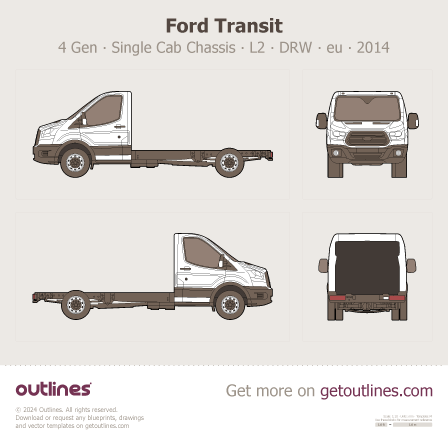 This 2014 Ford Transit 4 Gen Single Cab Chassis ∙ L2 ∙ DRW ∙ eu ∙ uk Van blueprint helps designers, wrap studios, and 3D artists simplify their workflow and save valuable time for creative work instead of routine tasks.