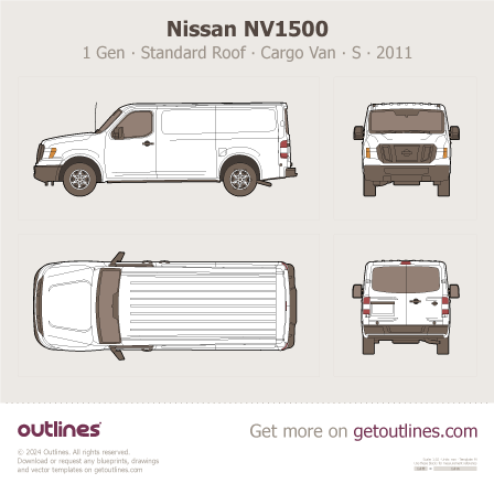 This 2011 Nissan NV1500 Cargo Van ∙ Standard Roof ∙ S ∙ Top View Van blueprint helps designers, wrap studios, and 3D artists simplify their workflow and save valuable time for creative work instead of routine tasks.