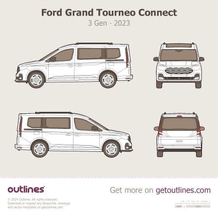 This 2021 Ford Tourneo Connect 3 Gen ∙ Grand MPV ∙ LWB ∙ uk ∙ eu Minivan blueprint helps designers, wrap studios, and 3D artists simplify their workflow and save valuable time for creative work instead of routine tasks.