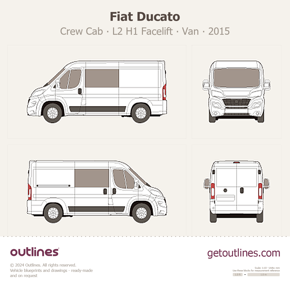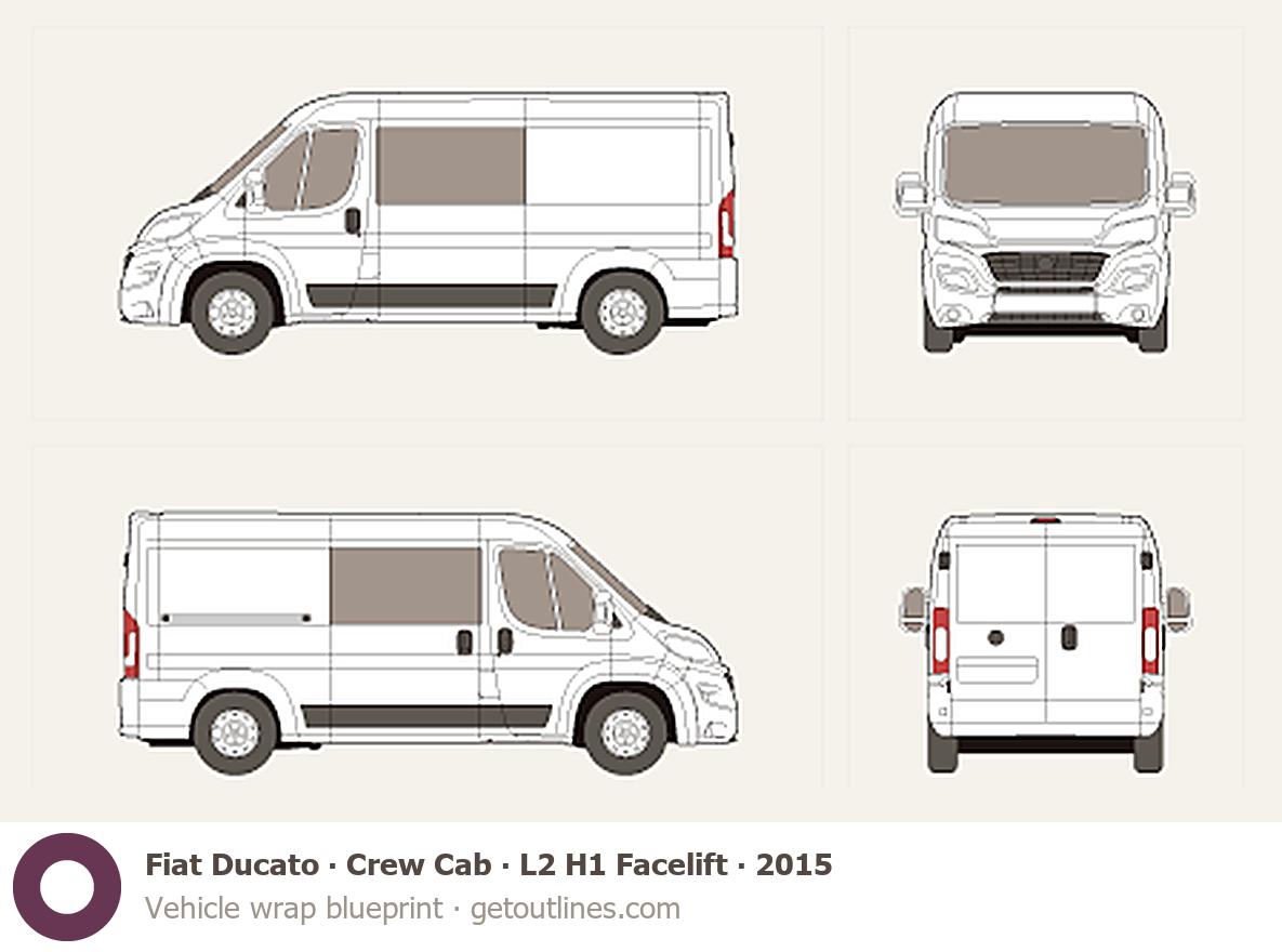 This 2015 Fiat Ducato Crew Cab L2 H1 Facelift Van blueprint helps designers, wrap studios, and 3D artists simplify their workflow and save valuable time for creative work instead of routine tasks.