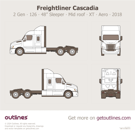 This 2018 Freightliner Cascadia 2 Gen 126” BBC ∙ 48” Sleeper ∙ Mid Roof ∙ XT ∙ Aero Heavy Truck blueprint helps designers, wrap studios, and 3D artists simplify their workflow and save valuable time for creative work instead of routine tasks.