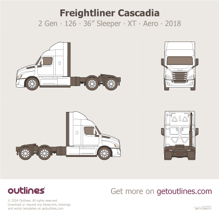 This 2018 Freightliner Cascadia 2 Gen 126” BBC ∙ 36” Sleeper ∙ XT ∙ Aero Heavy Truck blueprint helps designers, wrap studios, and 3D artists simplify their workflow and save valuable time for creative work instead of routine tasks.