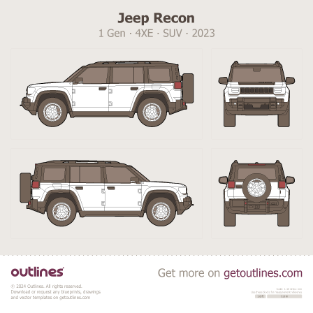 Buy this Jeep Recon 1 Gen ∙ 4XE blueprint and line drawing in high-quality editable vector file formats. Best for 3D and car wrap design.