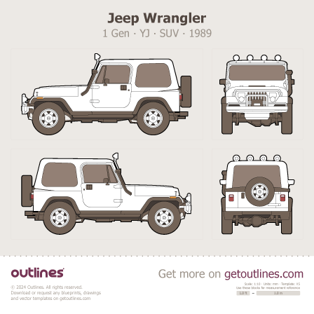 This is a blueprint of the YJ, produced by carmaker Jeep in 1987 - 1995. It features a SUV body design and is classified as a Offroad vehicle.