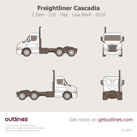 This 2018 Freightliner Cascadia 2 Gen 116” BBC ∙ Day ∙ Low Roof Heavy Truck blueprint helps designers, wrap studios, and 3D artists simplify their workflow and save valuable time for creative work instead of routine tasks.