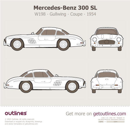 This is a blueprint of the 300 SL, produced by carmaker Mercedes-Benz in 1954 - 1963. It features a Coupe body design and is classified as a Sports car vehicle.