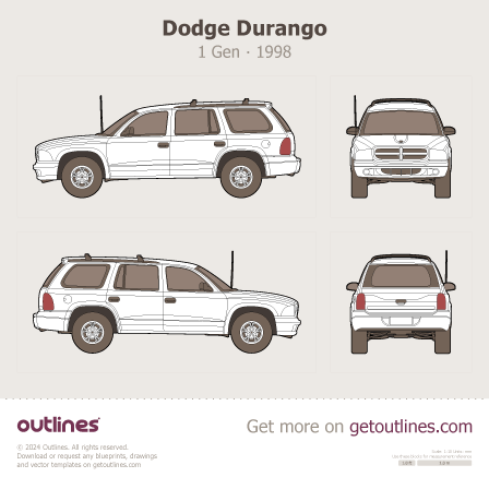 This is a blueprint of the Durango, produced by carmaker Dodge in 1998 - 2003. It features a SUV body design and is classified as a Offroad vehicle.