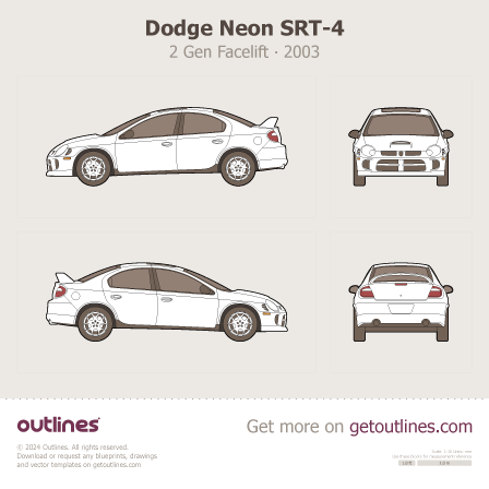 Buy this Dodge Neon SRT-4 ∙ 2 Gen Facelift blueprint and line drawing in high-quality editable vector file formats. Best for 3D and car wrap design.