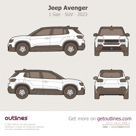 Buy this Jeep Avenger 1 Gen blueprint and line drawing in high-quality editable vector file formats. Best for 3D and car wrap design.