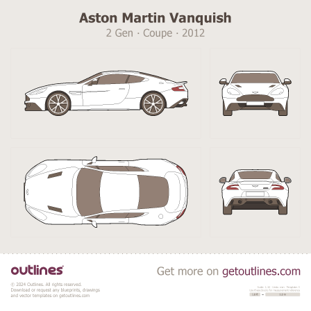 This is a blueprint of the Vanquish, produced by carmaker Aston Martin in 2012 - 2018. It features a Coupe body design and is classified as a Supercar vehicle.