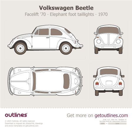 Buy this Volkswagen Beetle Facelift '70 blueprint and line drawing in high-quality editable vector file formats. Best for 3D and car wrap design.