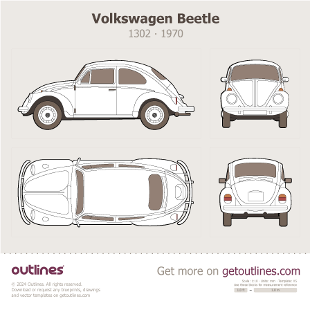 Buy this Volkswagen Beetle 1302 blueprint and line drawing in high-quality editable vector file formats. Best for 3D and car wrap design.