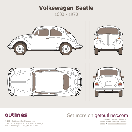 Buy this Volkswagen Beetle 1600 blueprint and line drawing in high-quality editable vector file formats. Best for 3D and car wrap design.