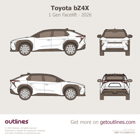 Buy this Toyota bZ4X 1 Gen Facelift blueprint and line drawing in high-quality editable vector file formats. Best for 3D and car wrap design.