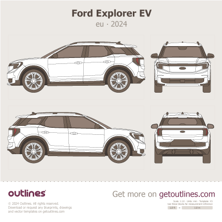 Buy this Ford Explorer EV blueprint and line drawing in high-quality editable vector file formats. Best for 3D and car wrap design.