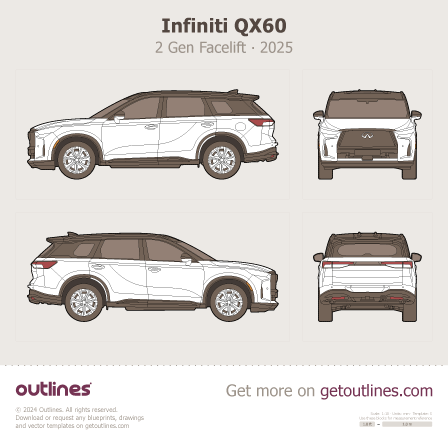 Buy this Infiniti QX60 2 Gen Facelift blueprint and line drawing in high-quality editable vector file formats. Best for 3D and car wrap design.