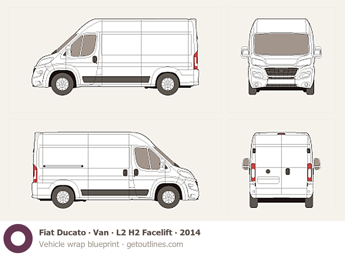 This 2014 Fiat Ducato Van L2 H2 Facelift Van blueprint helps designers, wrap studios, and 3D artists simplify their workflow and save valuable time for creative work instead of routine tasks.