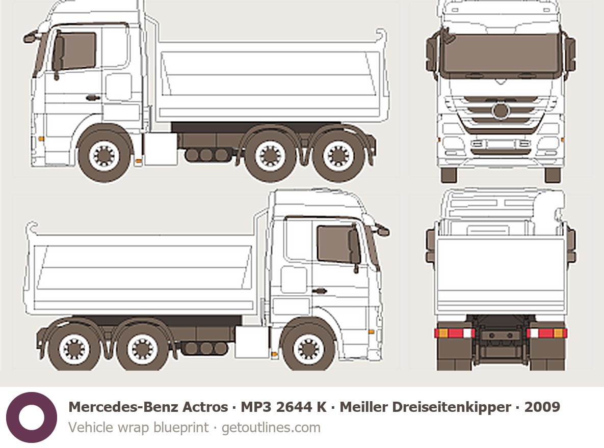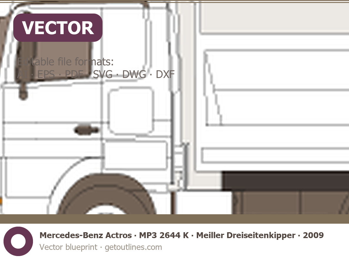 Buy this Mercedes-Benz Actros MP3 2644 K blueprint and line drawing in high-quality editable vector file formats. Best for 3D and car wrap design.