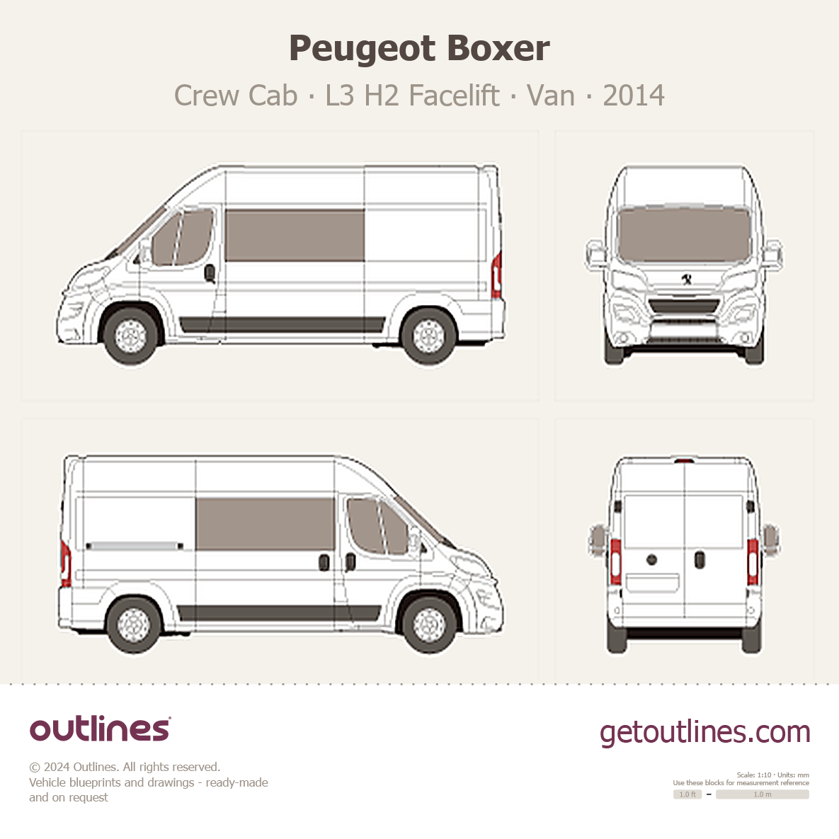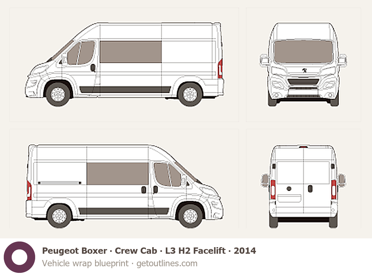 This 2014 Peugeot Boxer Crew Cab L3 H2 Facelift Van blueprint helps designers, wrap studios, and 3D artists simplify their workflow and save valuable time for creative work instead of routine tasks.