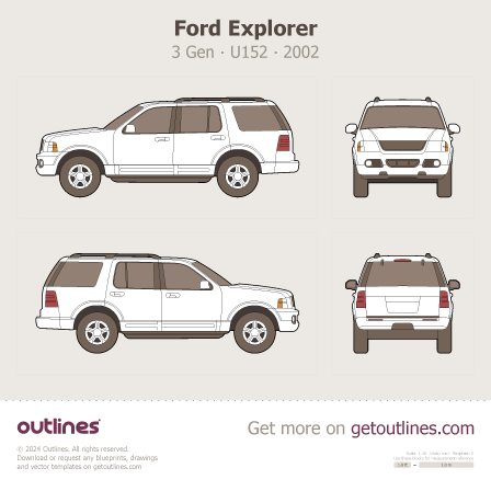 Buy this Ford Explorer 3 Gen ∙ U152 ∙ III blueprint and line drawing in high-quality editable vector file formats. Best for 3D and car wrap design.