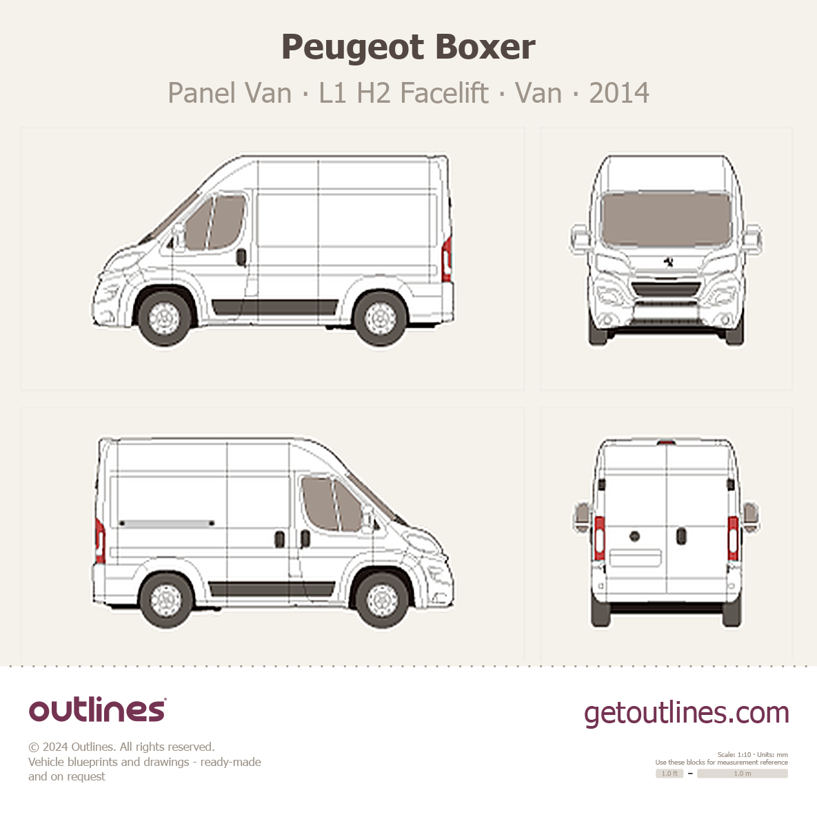 This 2014 Peugeot Boxer Panel Van L1 H2 Facelift Van blueprint helps designers, wrap studios, and 3D artists simplify their workflow and save valuable time for creative work instead of routine tasks.