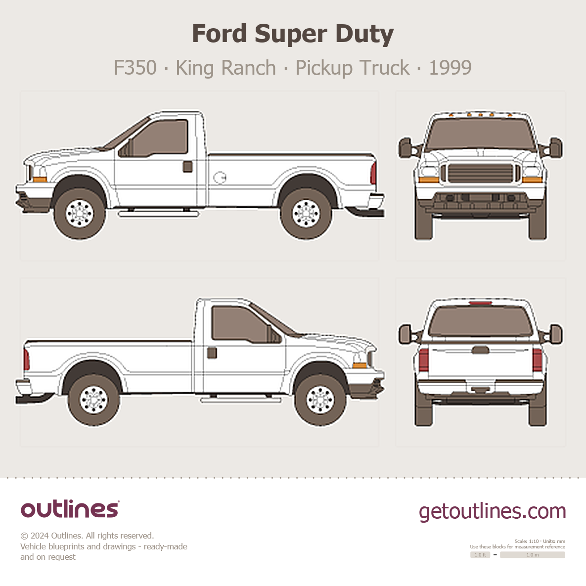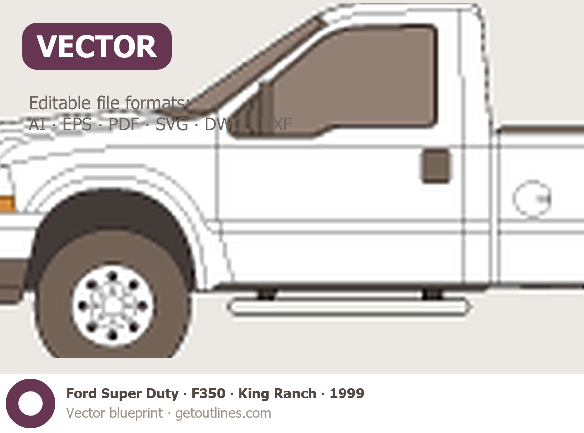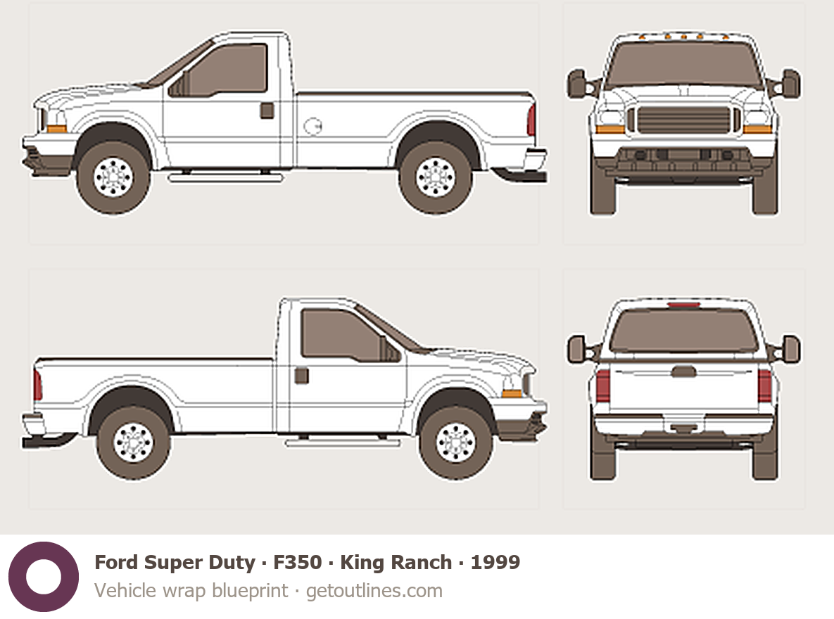 This 1999 Ford Super Duty F350 King Ranch Pickup Truck blueprint helps designers, wrap studios, and 3D artists simplify their workflow and save valuable time for creative work instead of routine tasks.