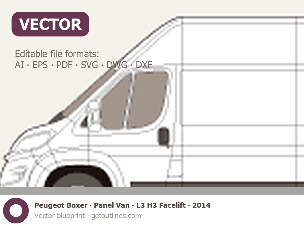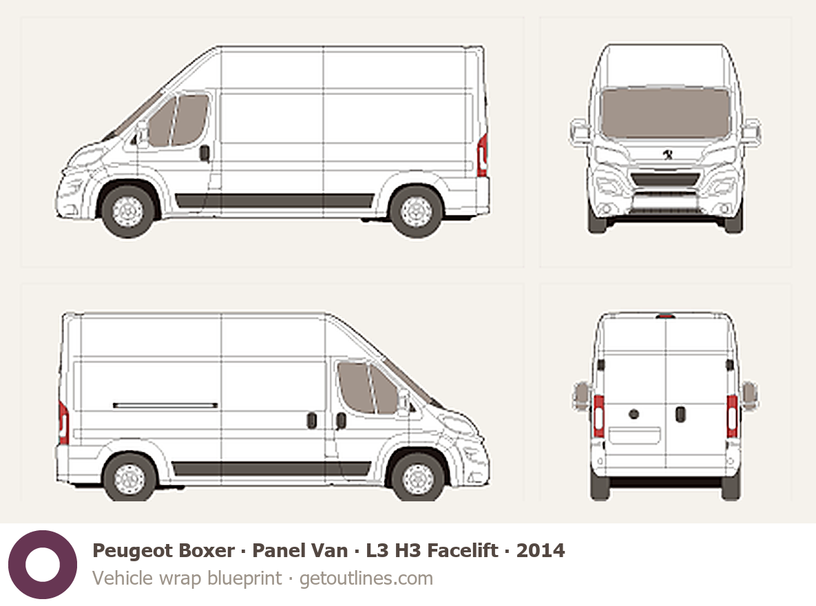 This 2014 Peugeot Boxer Panel Van L3 H3 Facelift Van blueprint helps designers, wrap studios, and 3D artists simplify their workflow and save valuable time for creative work instead of routine tasks.