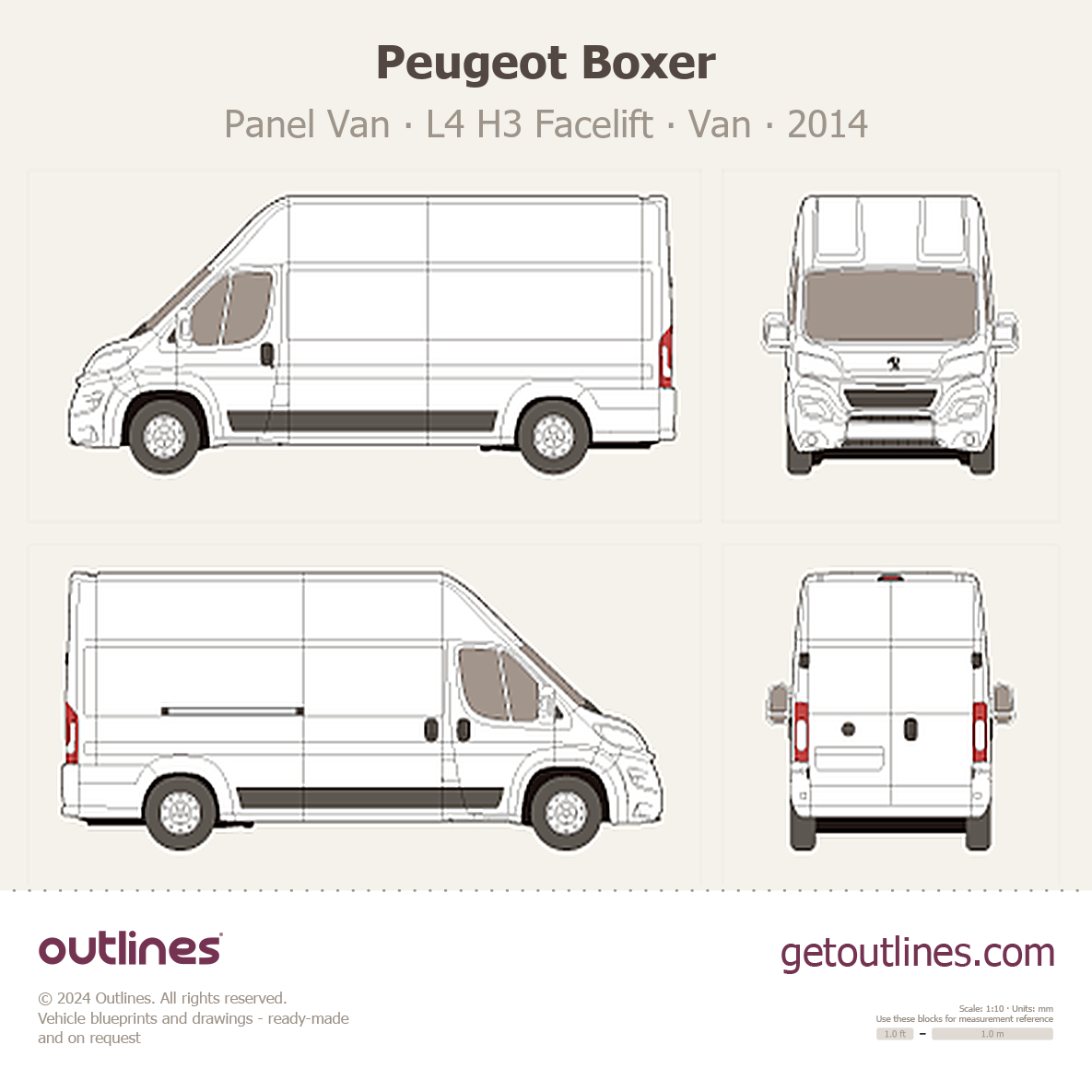 This is a blueprint of the Boxer, produced by carmaker Peugeot in 2014 - Present (2025, 2026). It features a Van body design and is classified as a Commercial vehicle.