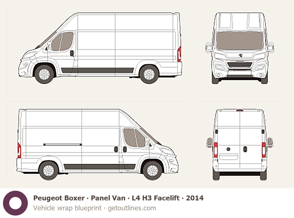 This 2014 Peugeot Boxer Panel Van L4 H3 Facelift Van blueprint helps designers, wrap studios, and 3D artists simplify their workflow and save valuable time for creative work instead of routine tasks.