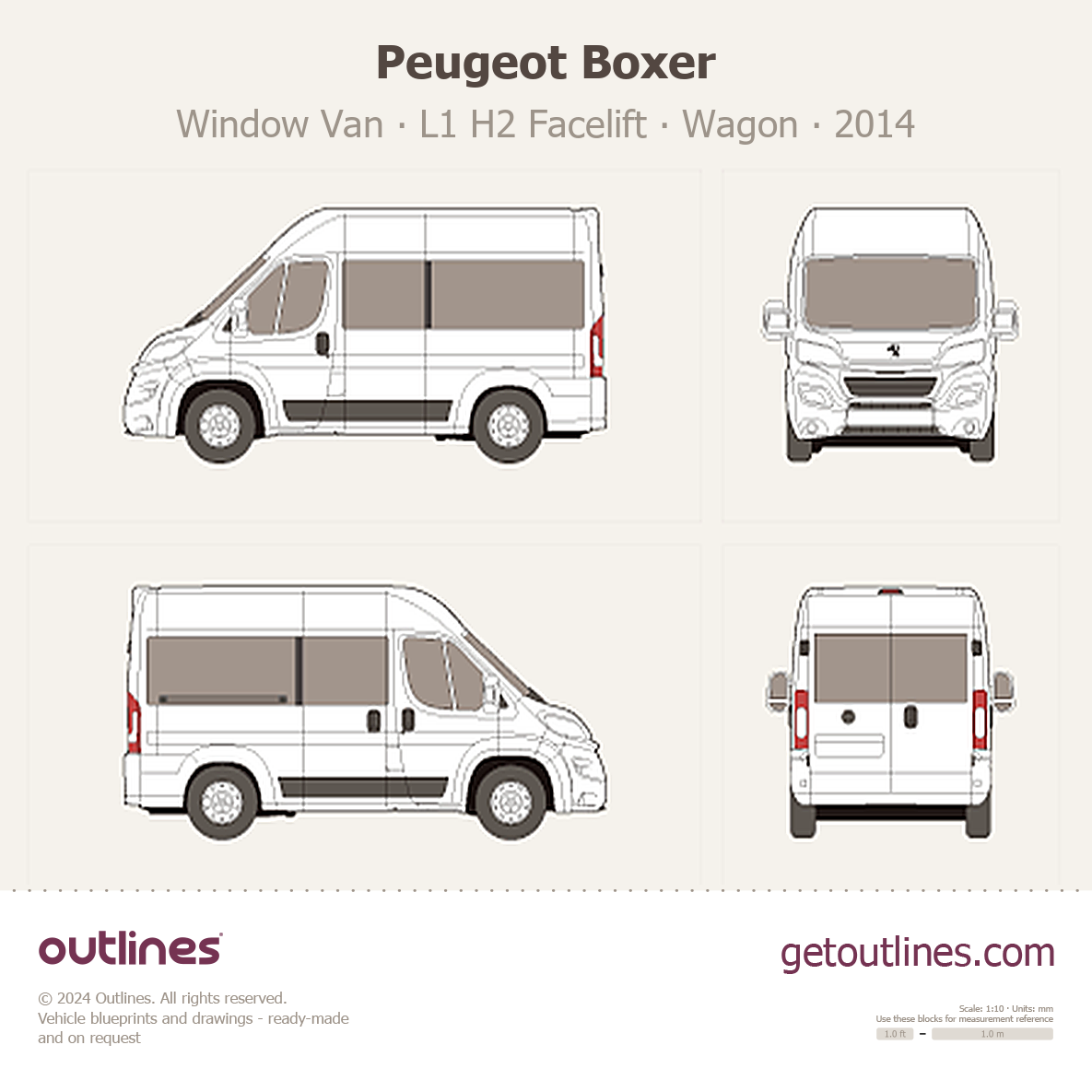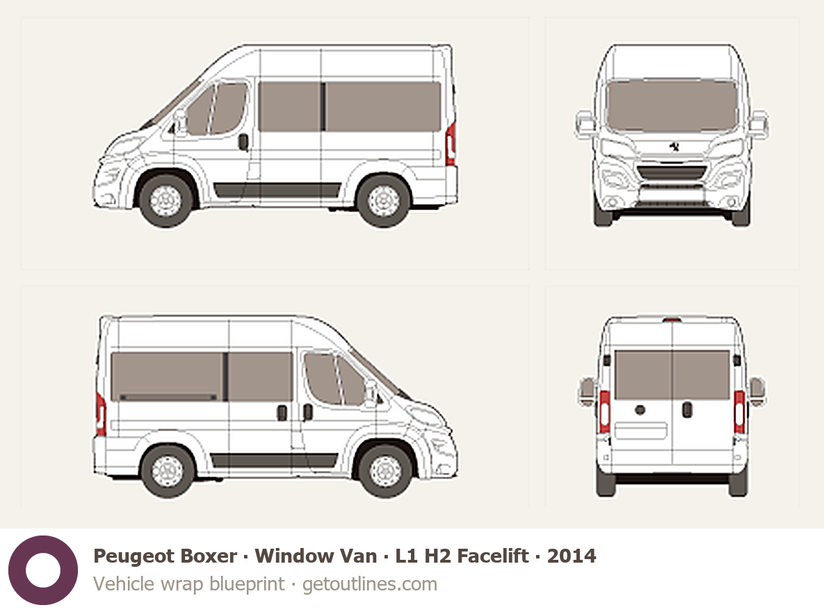 This 2014 Peugeot Boxer Window Van L1 H2 Facelift Wagon blueprint helps designers, wrap studios, and 3D artists simplify their workflow and save valuable time for creative work instead of routine tasks.