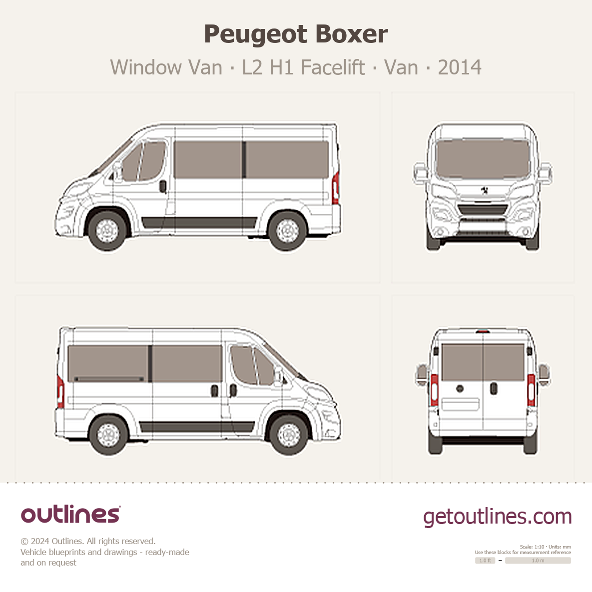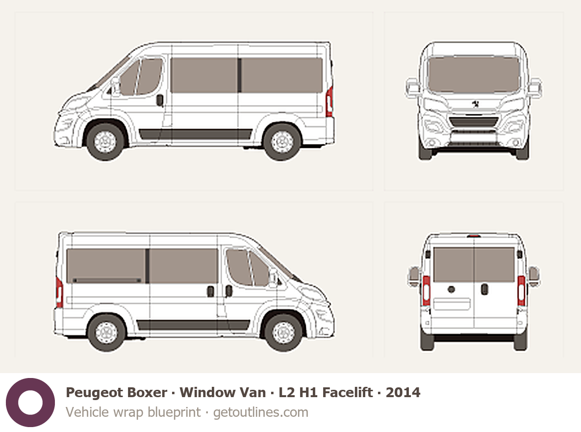 This 2014 Peugeot Boxer Window Van L2 H1 Facelift Van blueprint helps designers, wrap studios, and 3D artists simplify their workflow and save valuable time for creative work instead of routine tasks.