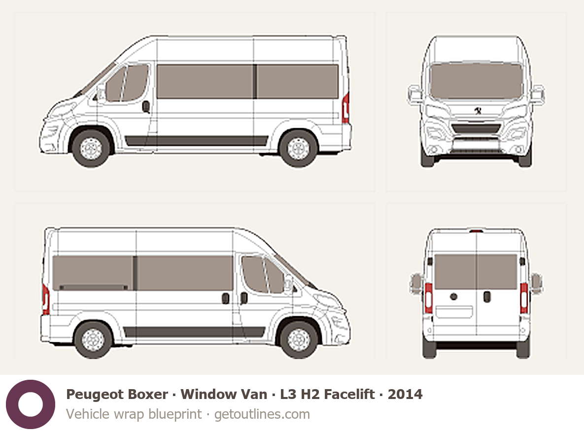 This 2014 Peugeot Boxer Window Van L3 H2 Facelift Van blueprint helps designers, wrap studios, and 3D artists simplify their workflow and save valuable time for creative work instead of routine tasks.