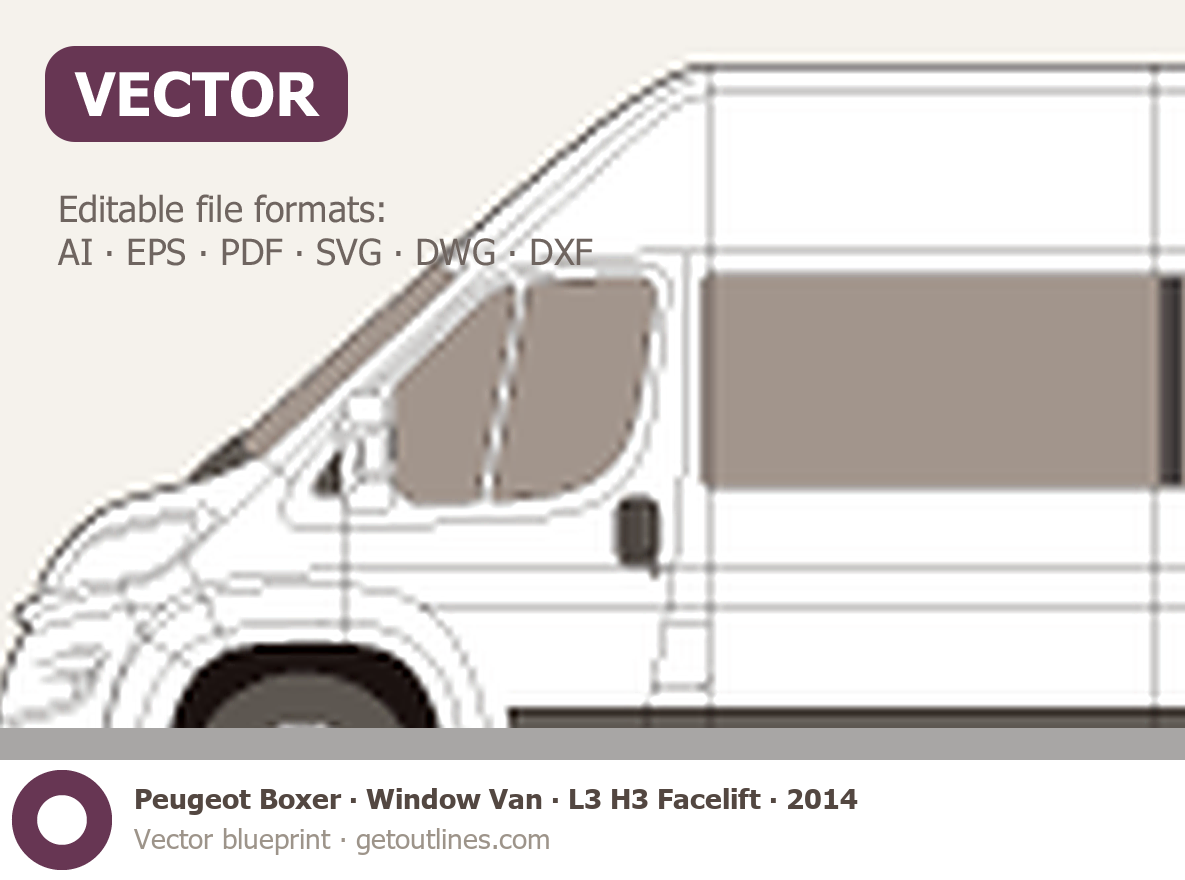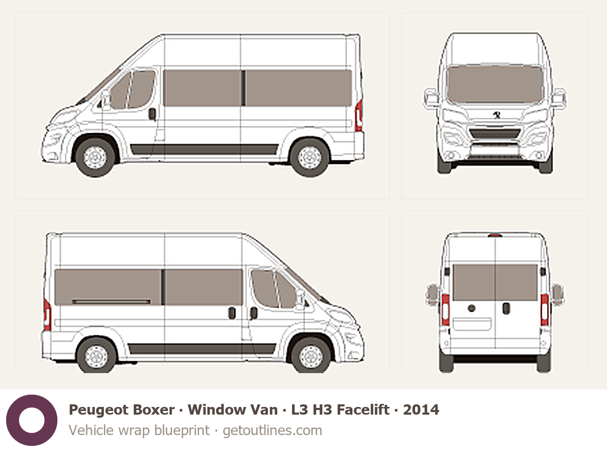 This 2014 Peugeot Boxer Window Van L3 H3 Facelift Van blueprint helps designers, wrap studios, and 3D artists simplify their workflow and save valuable time for creative work instead of routine tasks.