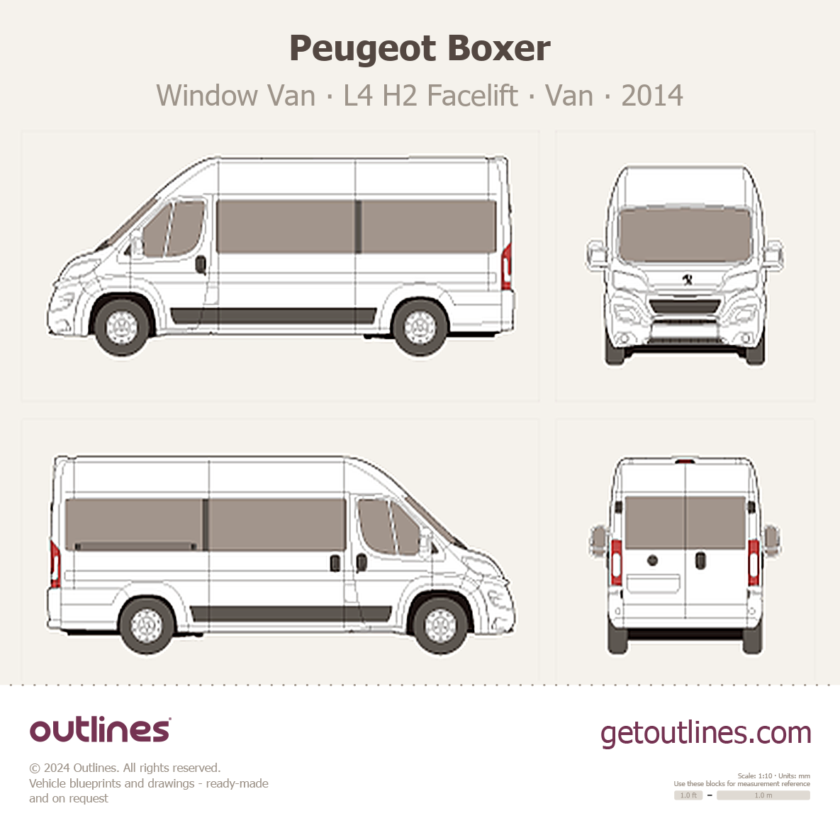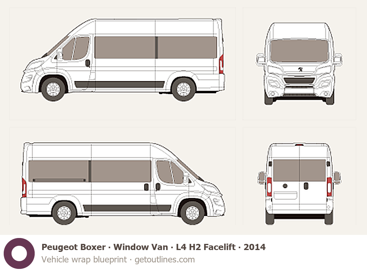 This 2014 Peugeot Boxer Window Van L4 H2 Facelift Van blueprint helps designers, wrap studios, and 3D artists simplify their workflow and save valuable time for creative work instead of routine tasks.