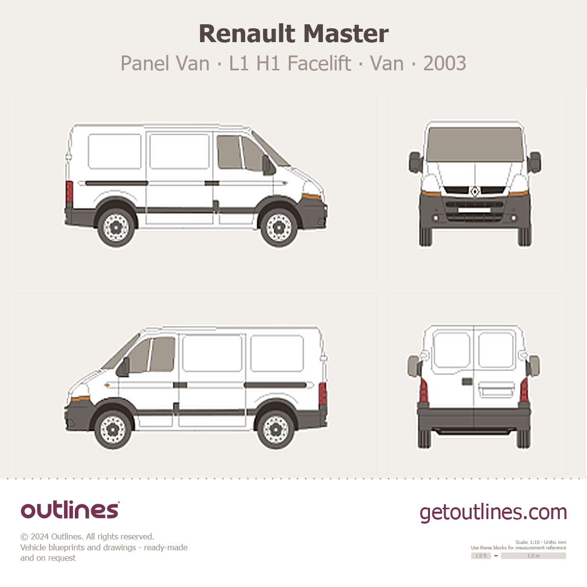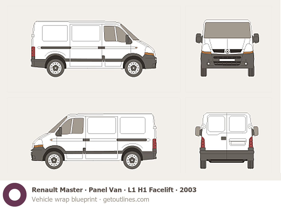This 2003 Renault Master Panel Van L1 H1 Facelift Van blueprint helps designers, wrap studios, and 3D artists simplify their workflow and save valuable time for creative work instead of routine tasks.