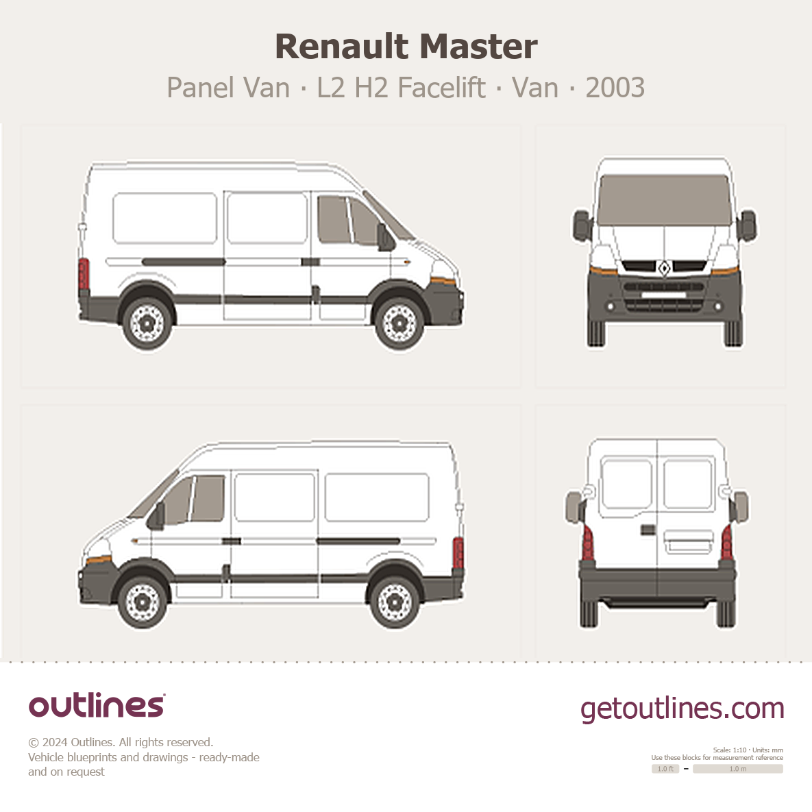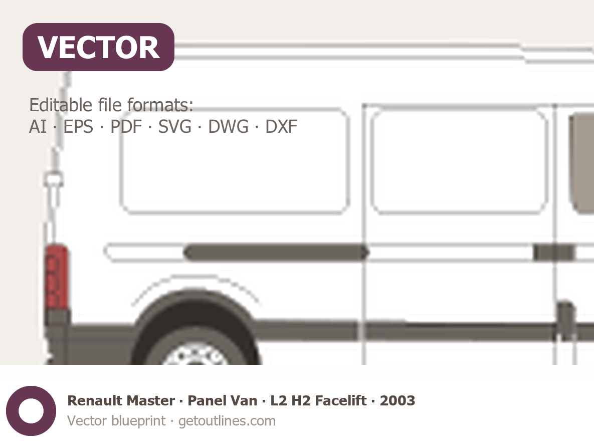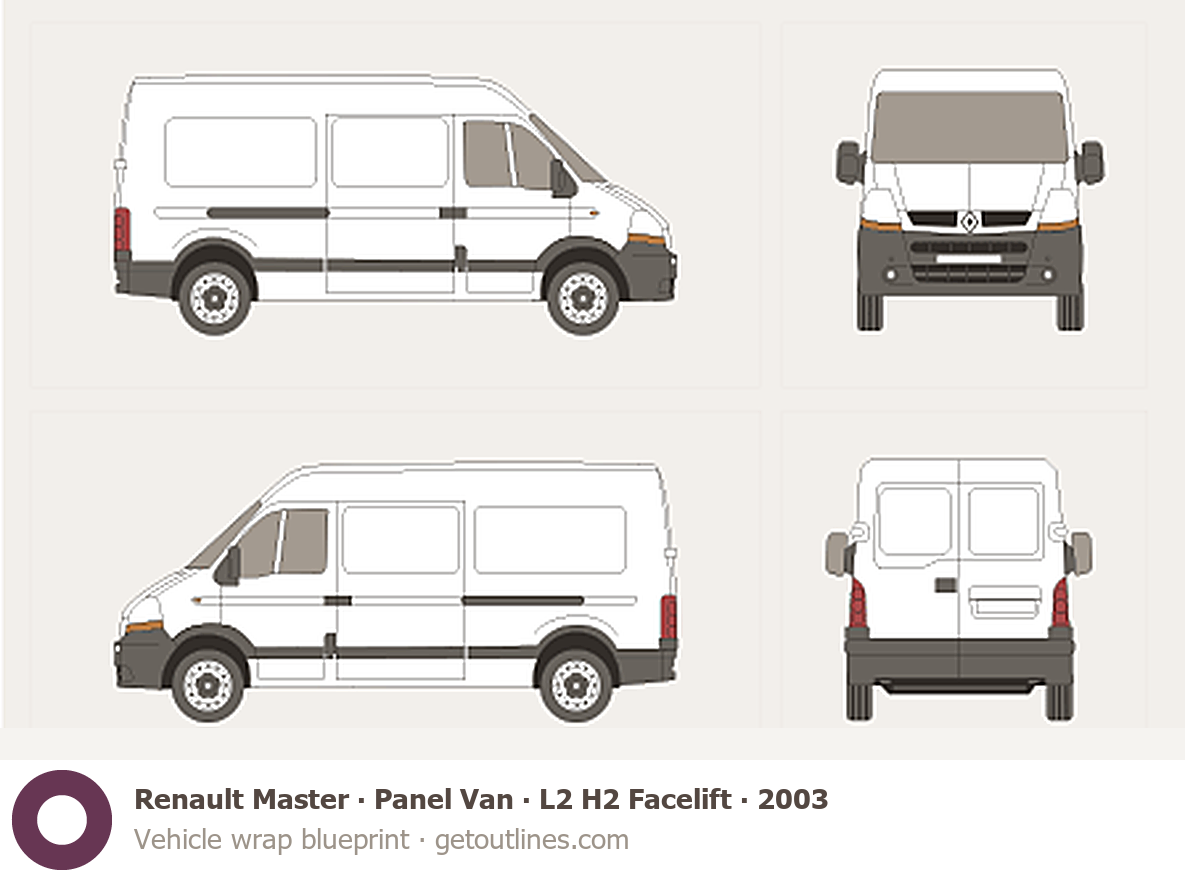 This 2003 Renault Master Panel Van L2 H2 Facelift Van blueprint helps designers, wrap studios, and 3D artists simplify their workflow and save valuable time for creative work instead of routine tasks.