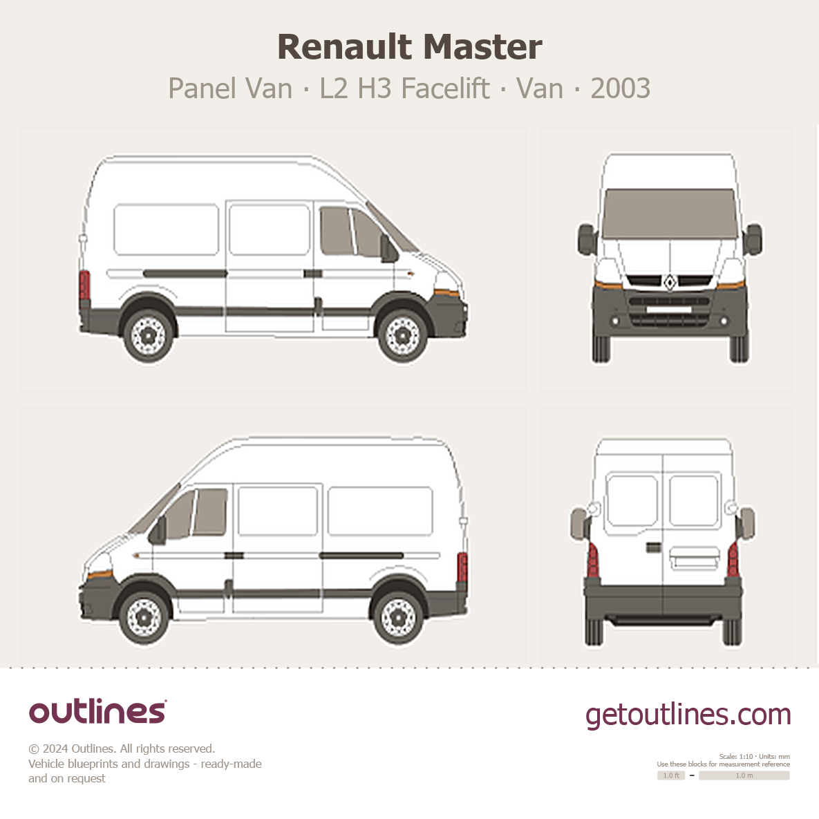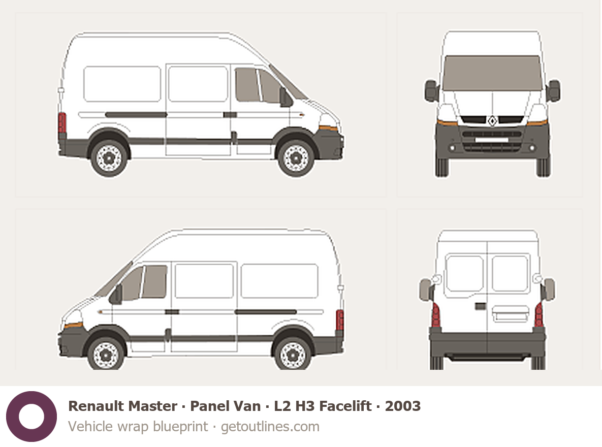 This 2003 Renault Master Panel Van L2 H3 Facelift Van blueprint helps designers, wrap studios, and 3D artists simplify their workflow and save valuable time for creative work instead of routine tasks.